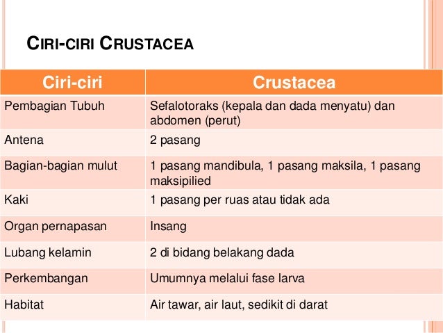 Ciri-ciri Crustacea adalah hidup di air bernapas dengan insang eksoskeleton keras terdiri atas zat kitin yang berlendir mempunyai sepasang antena dan alat tambahan bercabang dua tipikal biramus serta kepala bersegmen yang bersatu dengan dada membentuk sefalotoraks kepala dada. Mempunyai dua 2 lubang genital yang terdapat di belakang dada. Ciri Ciri Crustacea Hewan yang masuk ke dalam golongan crustacean ini memiliki beberapa ciri khusus yang beberapa diantaranya tidak dimiliki hewan lain.