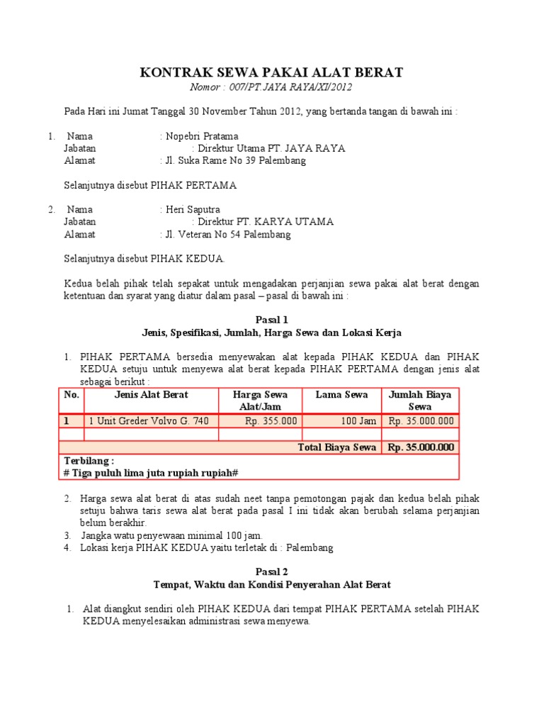 Pasal II Tempat Waktu dan Kondisi Penyerahan Alat Berat 1. February 21 2018 at 302 AM. Harga sewa alat berat diatas sudah neet tanpa pemotongan pajak dan kedua belah pihak setuju bahwa tarif sewa alat berat pada pasal I tidak akan berubah selama perjanjian belum berakhir.