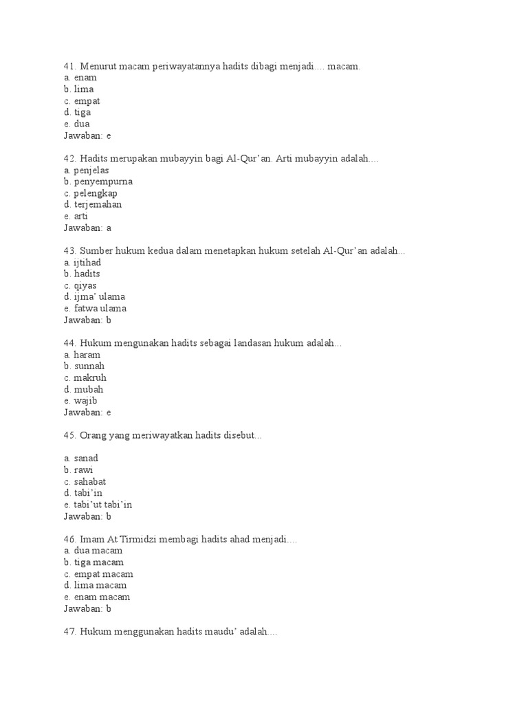 Keharusan mengikuti hadits bagi umat Islam baik yang berupa perintah maupun larangannya sama halnya dengan kewajiban mengikuti Al-Quran. Latihan Soal Pilihan Ganda Bab Hadist Imam At Tirmidzi membagi hadits ahad menjadi. Ia mempati kedudukan kedua setelah Al-Quran.