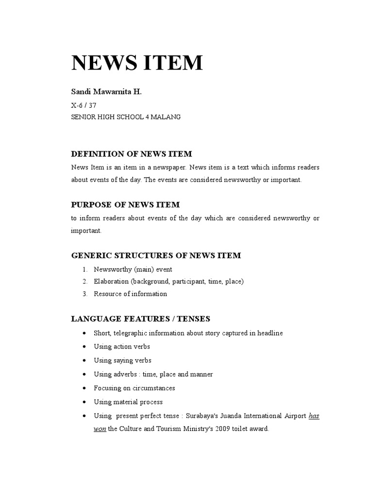News item text contoh soal. Contoh Recount Text beserta Soal dan Jawaban - Picasso. Dengan syarat jika berita tersebut layak atau pantas untuk di konsumsi oleh masyarakat umum. Beberapa ahli bahasa inggris mendefinisikan news item text sebagai berikut.