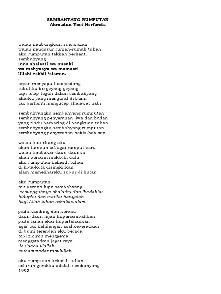 PUISI SEMBAHYANG RUMPUTAN KARYA. Kumpulan puisi ini pada tahun 2005 diterbitkan dalam dua bahasa Indonesia dan Inggris dengan judul Sembahyang Rumputan The Worshipping Grass. September 18 2015 Post a Comment karya Ahmadun Y Herfanda.