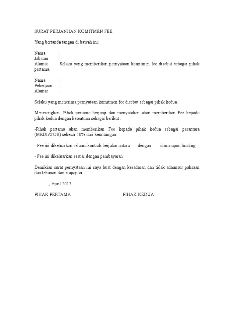 Direktur PT ABC Alamat. Contoh surat perjanjian komitmen fee. Jika Anda menjadi mediator atau jasa perantara jual beli biasanya akan mendapat fee ataupun uang komisi dari pihak penjual.