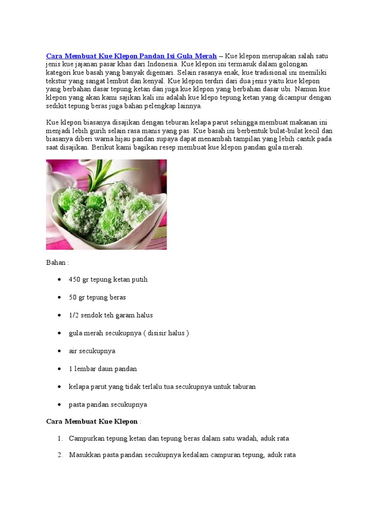 Contoh Teks Prosedur Kompleks. - 600 gr ubi ungu kukus - 150 gr tepung ketan - 12 sdt garam - 50 ml air - 150 gr gula merah - 3 lembar daun pandan - 250 gr kelapa parut kukus Cara membuat. Deskripsi Bahasa Jawa Makanan Tradisional Klepon dipostkan pada.