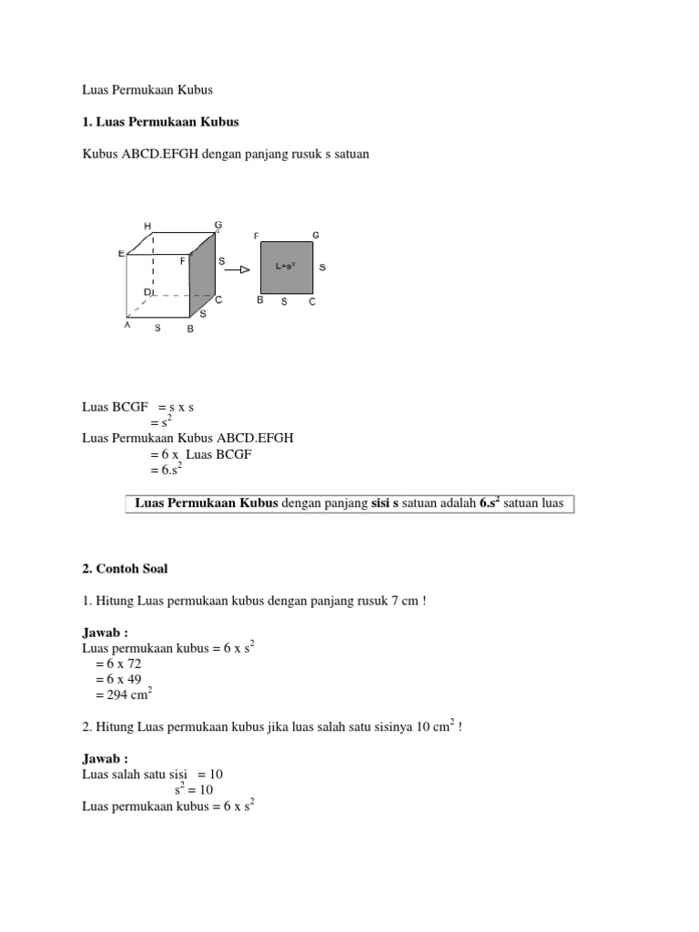 Cari dan hitunglah luas permukaan kubus tersebut. Luas permukaan kubus L 6 x s 2. 6 x S² s adalah sisi kubus.