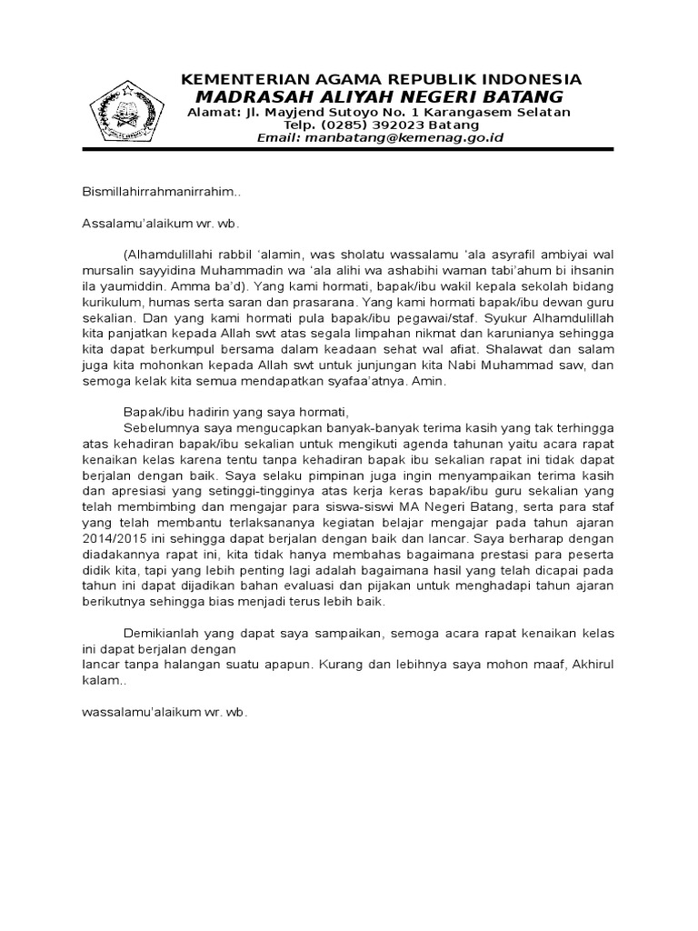 Assalamu Alaikum Warahmatullahi Wabarakatuh. Pidato Sambutan Rapat Kenaikan Kelas Written By Pak Guru Monday November 19 2018 Add Comment Edit Pidato sambutan dalam acara rapat kenaikan kelas ini berisi teks contoh pidato sambutan kepala sekolah dan ketua pelaksana rapat dalam acara kenaikan kelas di SD SMP SMA atau SMK. Contoh pidato perpisahan kelas 9 mudah dihafal singkat lengkap praktis sedih panjang pendek 2018 2019 2020 perwakilan kelas 9 kelas 8.