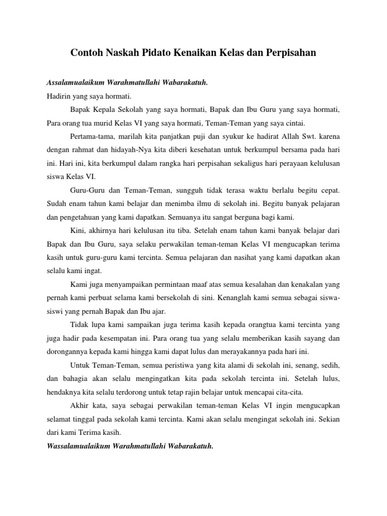 Contoh Pidato Perpisahan Kelas 6 Pidato Perpisahan SD. Contoh Naskah Pidato Kenaikan Kelas dan Perpisahan Assalamualaikum Warahmatullahi Wabarakatuh. Hadirin yang saya hormati.