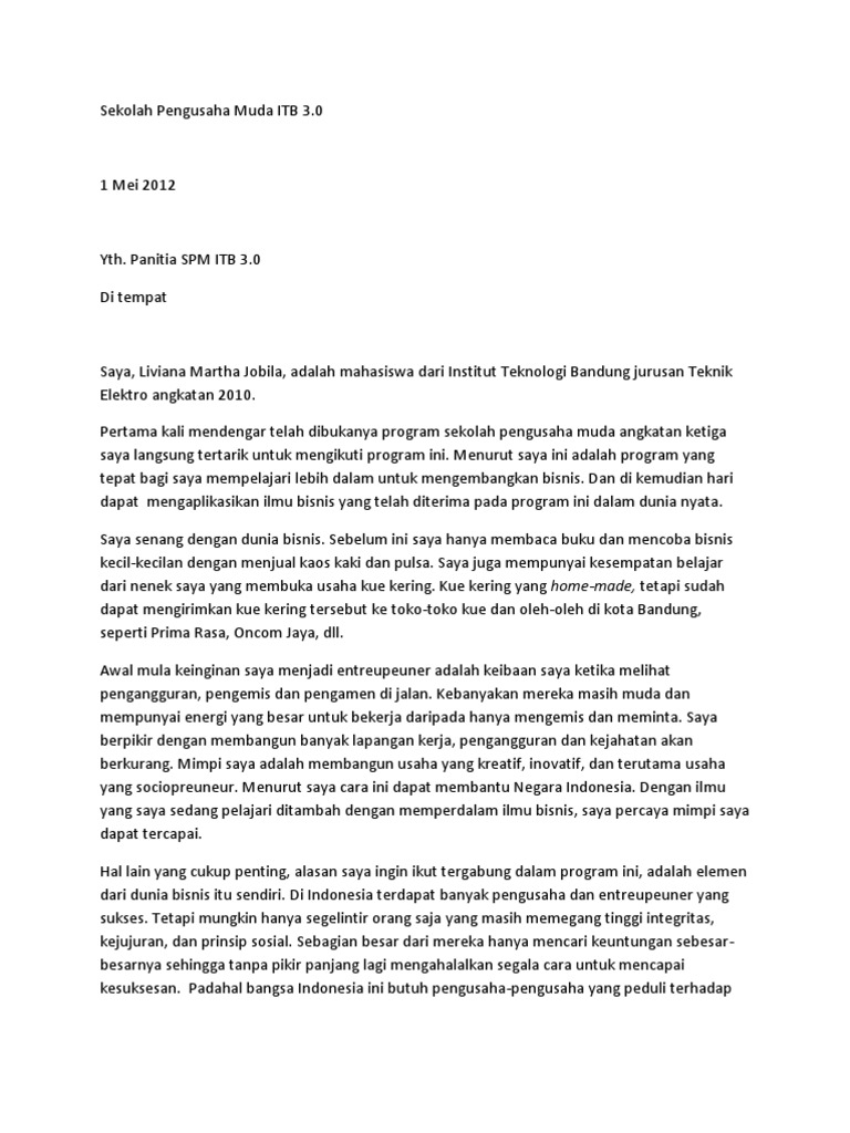 Seiring dengan beberapa poin umum yang harus dibuat di mana pun Anda mengirim surat motivasi Anda kualifikasi tujuan minat minat yang terkait dengan studi Anda ada juga beberapa detail penting untuk ditambahkan ketika mendaftar ke sekolah di luar negeri. Motivation letter merupakan sebuah surat yang berisi motivasi kita mengapa kita ingin melamar pekerjaan atau beasiswa tersebut dan apa nilai jual dari diri kita oleh sebab itu sampaikan hal tersebut dengan bahasa yang santai namun tetap mudah di pahami dan jelas tidak bertele-tele. Tidak sedang menerima Beasiswa dan dalam status ikatan dinas dari lembagainstansi lain Memiliki pengalaman menjalankan aktivitas sosial dan bersedia aktif di GENBI Indeks Prestasi min 300 Skala 4 1 surat rekomendasi tokoh akademik atau non-akademik Resume pribadi surat motivasi Berasal dari keluarga pra.