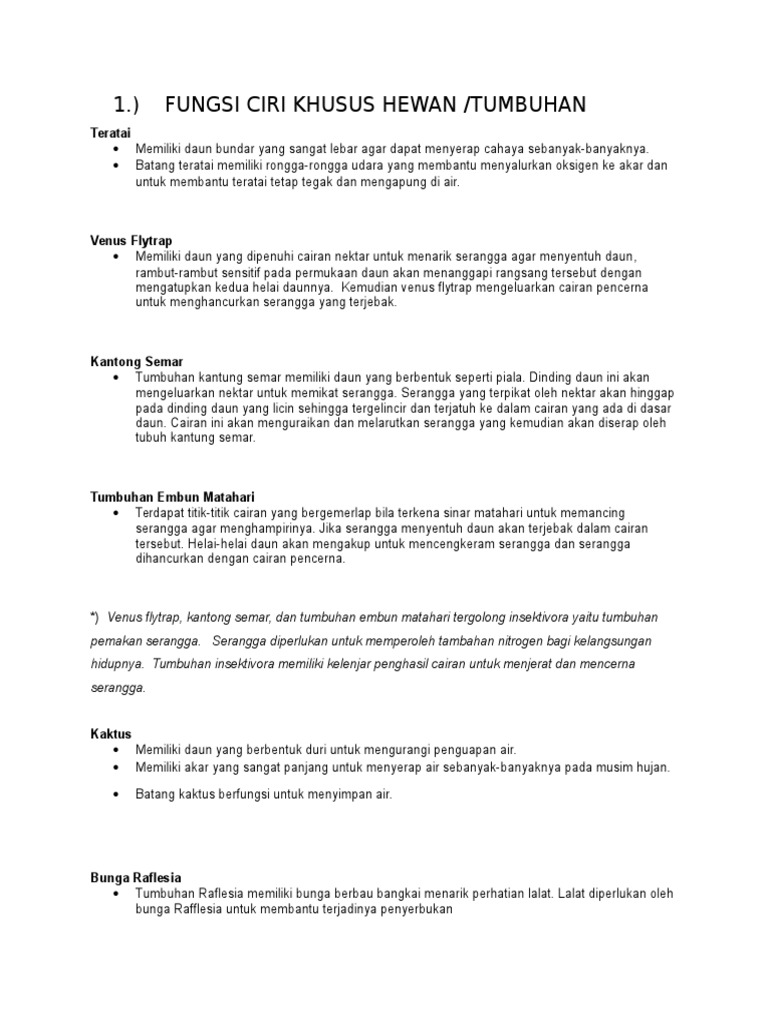 Ciri Khusus Hewan dan Tumbuhan No Hewan Ciri Khusus Fungsi Mengeluarkanmenangkap bunyi ultrasonic 1 Kelelawar Pendengaran tajam Memperoleh makanan Mempunyai kemampuan ekolokasi 2 Landak Kulit berduri Melindungi diri dari musuh Autotomi memutuskan ekornya Melindungi diri 3 Cicak Memiliki perekat pada kakinya Berjalan di dinding Lidah panjang dan lengket. Pada buah cabe yang terserang hama lalat buah Bactrocera dorsalis maka ketika buah cabenya dibelah menjadi beberapa bagian maka akan nampak adanya larva lalatPada awalnya larva tersebut dalam bentuk belatung kecil-kecil yang tinggal pada daging buah cabe kemudian berkembang menjadi larva lalat buah yang siap tumbuh. Ciri khusus pada hewan ini berhubungan dengan kemampuannya dalam beradaptasi untuk bertahan hidup.