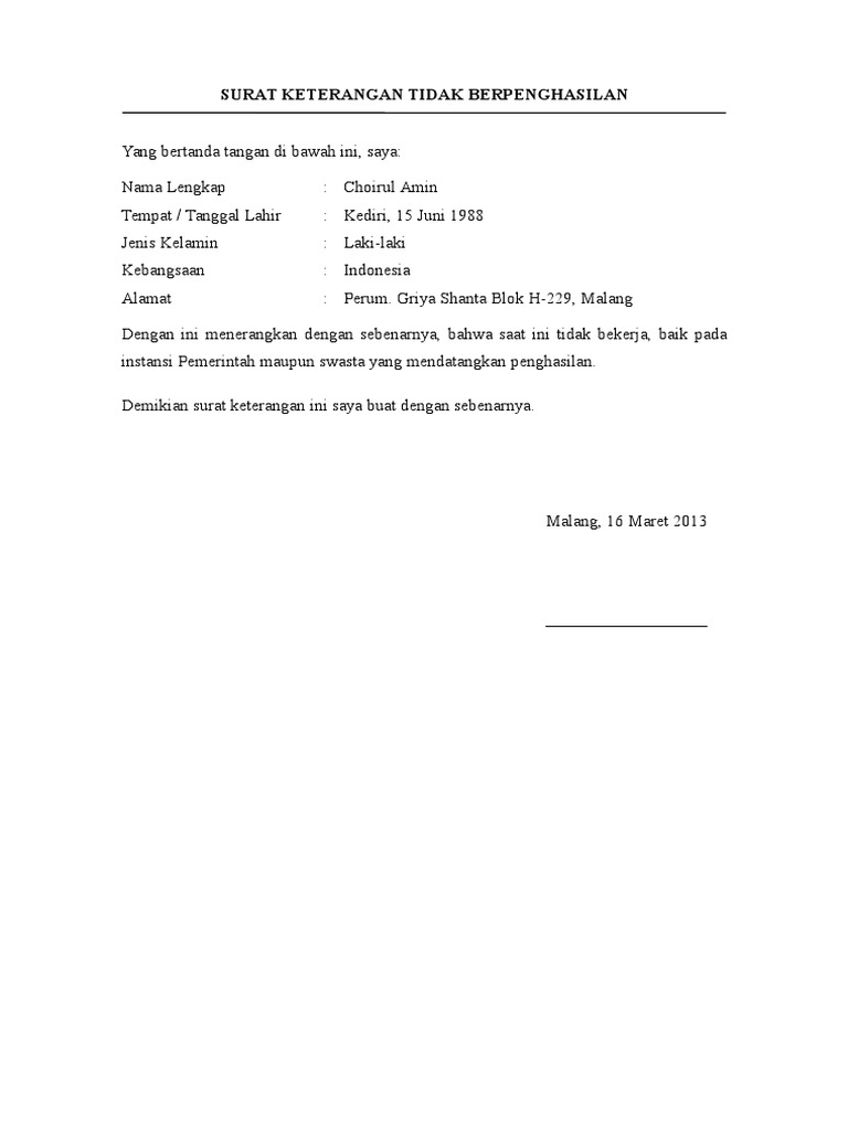 Surat ini juga bisa dipakai oleh seseorang yang ingin melamar pekerjaan dan juga mengikuti berbagai kegiatan dan program dari pemerintah dan swasta. Anasbuchori Genuine Location. Contoh surat pernyataan tidak berpenghasilan untuk pajak.