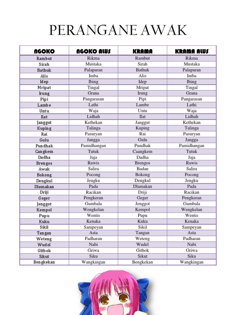 Berikut adalah nama anggota badan dalam bahasa jawa ngoko krama madaya dan krama inggil. Apalagi sebagai orang yang sedang belajar unggah ungguhing dalam kehidupan jawa. Kata krama inggil hanya digunakan dalam bahasa ngoko alus dan krama alus.