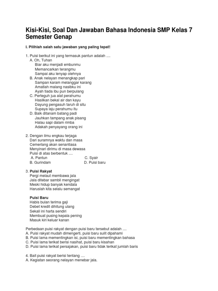Soal puisi rakyat kelas 7 beserta jawabannya. PETUNJUK UMUM Tulis namamu di sudut kanan atas. Baris pertama dan kedua berupa sampiran. Berikut ini kakak akan memberikan contoh soal PG Bahasa Indonesia kelas 7VII semester 2 beserta jawabannya kurikulum 2013 K13.